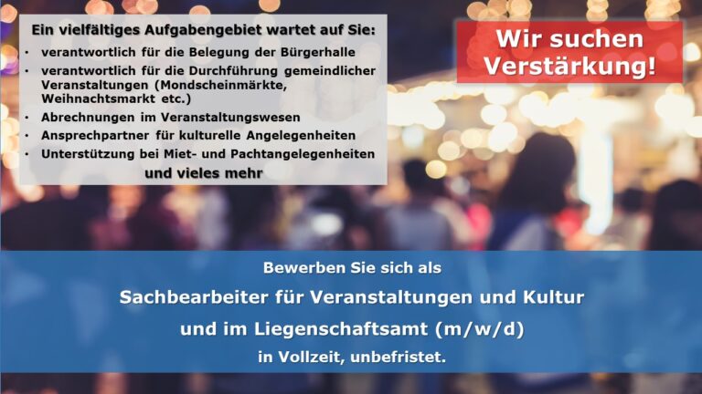 Wir suchen zum nächstmöglichen Zeitpunkt einen Sachbearbeiter für Veranstaltungen und Kultur