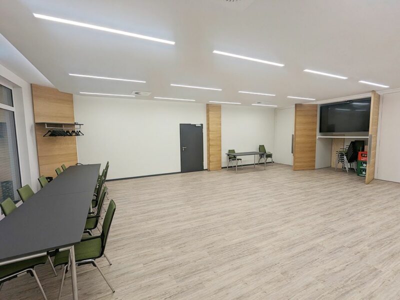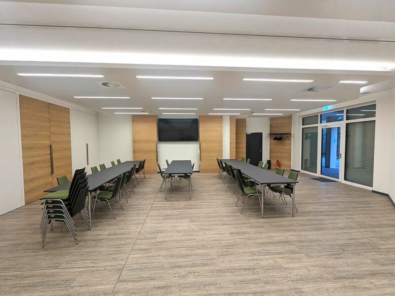 Der Raum kann sowohl als ein großer Raum genutzt, als auch in zwei separate Räume aufgeteilt werden, die beide mit einem großen Bildschirm ausgestattet sind.