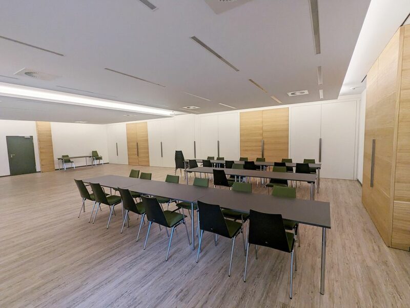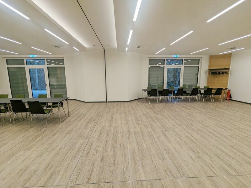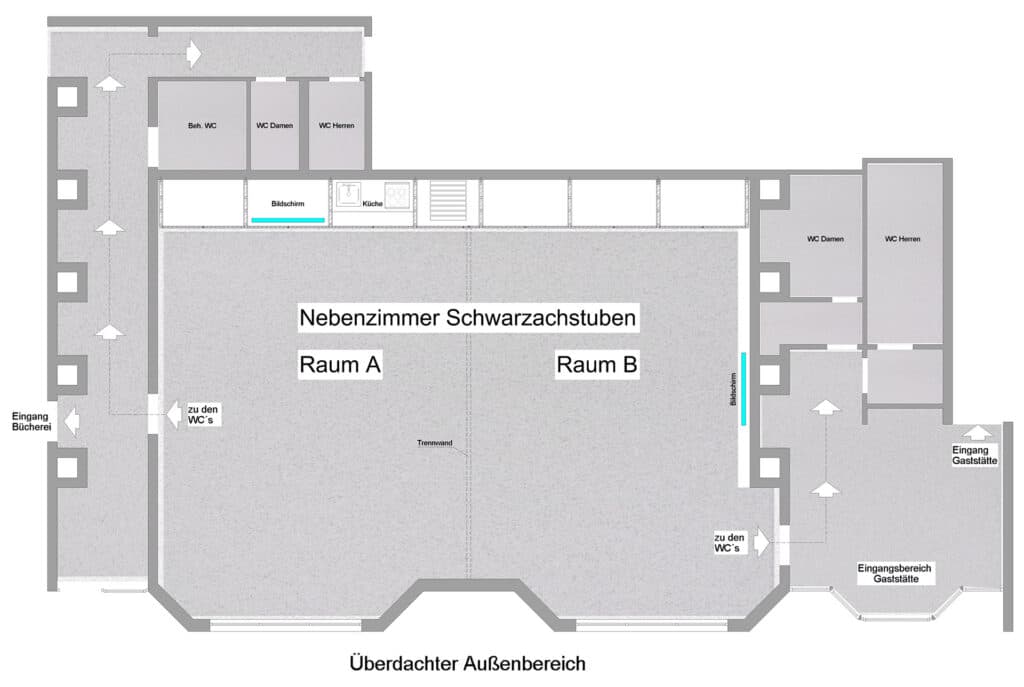 Das Nebenzimmer Schwarzachstuben befindet sich in unmittelbarer Nähe zur Gemeindebücherei sowie dem Restaurant im Kellergeschoss der Albrecht-Frister-Mehrzweckhalle. Er bietet flexible Gestaltungsmöglichkeiten für verschiedene Veranstaltungsformate wie Seminare, Konferenzen, Workshops und private Feierlichkeiten.