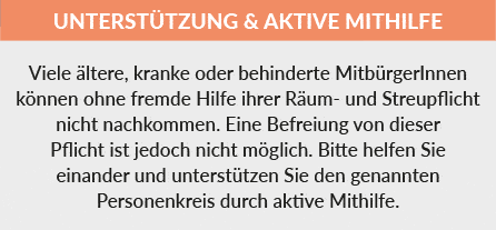 Der Inhalt dieser Streugutboxen ist nicht für den privaten Verbrauch bestimmt und darf auch nicht als Vorrat privat eingelagert werden. Alle BürgerInnen müssen ihrer Räum- und Streupflicht nachkommen und das dafür notwendige Material (Schneeschaufeln, Besen und Streugut) selbst kaufen.